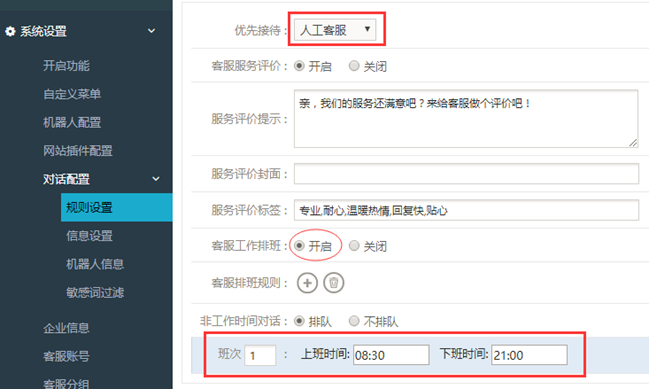 在 V5后台->系统设置->对话配置,第一项【优先接待】选择【人工客服】;并设置好客服工作时间。