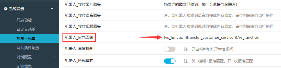 机器人模式二:保留机器人【日常聊天 + 自定义问答】,答不上的问题转人工,在系统设置->机器人配置->机器人_应急回答,这里选择【转人工客服】。