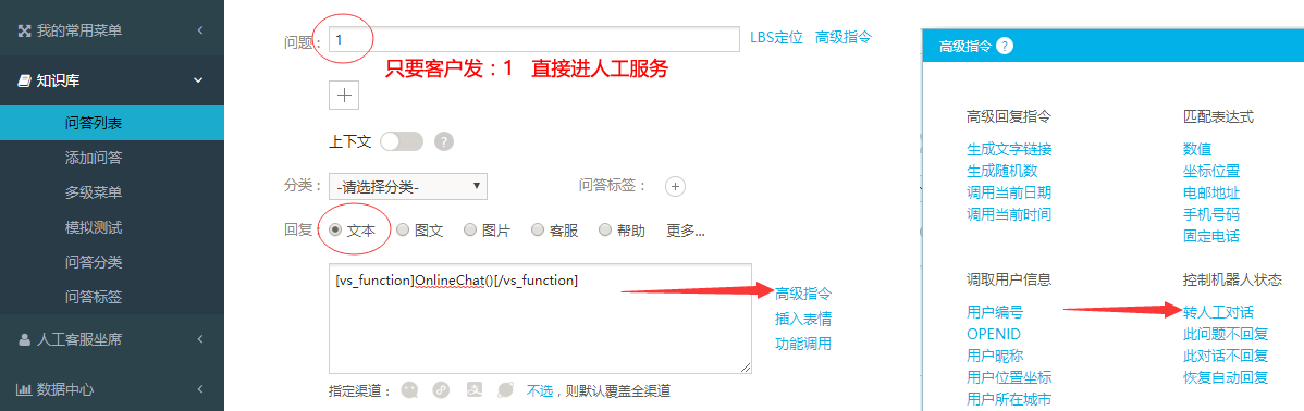 机器人模式三:指定关键字转客服,在 V5后台->知识库->问答列表->添加问答,问题栏编辑好触发关键词,回复内容选择【高级指令->转人工对话】,然后提交问答即可。