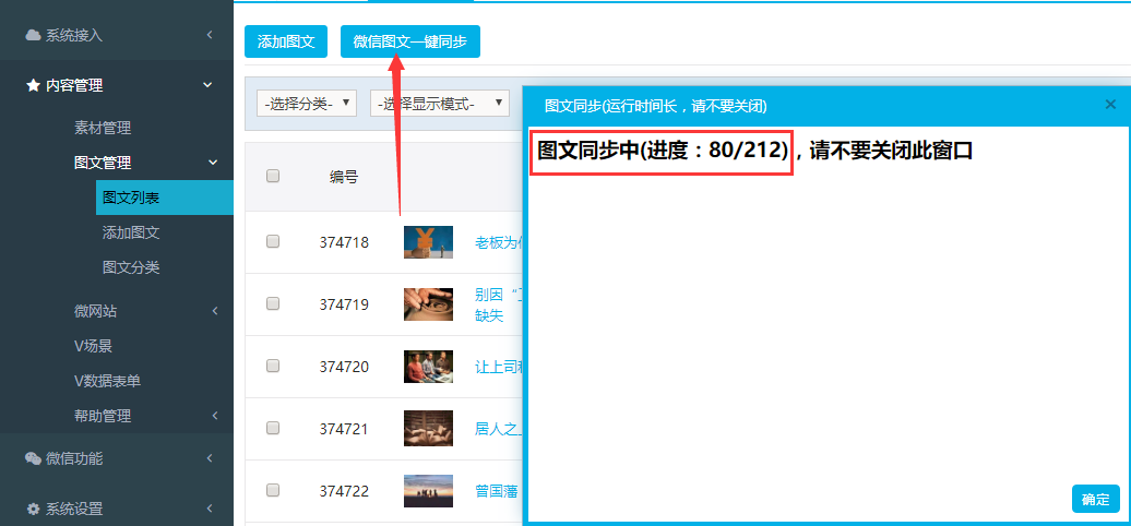 在 V5后台—内容管理—图文管理—图文列表,点击页面上方的【微信图文一键同步】按钮,等待系统把公众平台后台的图文同步到V5后台。