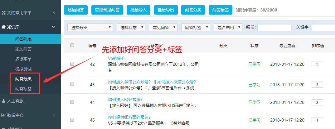 1、在添加机器人问答之前,可以先在 V5后台->知识库->问答分类/问答标签 下添加好问答分类、问答标签,便于后续管理及数据统计分析(也可跳过此步骤,后续再完善);