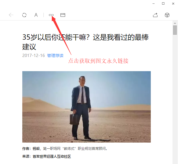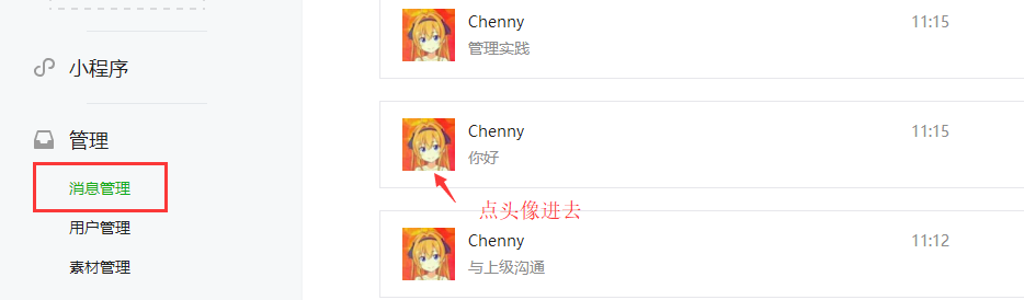 2、进入微信公众号后台->管理->消息管理,找到自己的对话,点击头像进去给自己回复需要的图文;然后在在微信电脑版打开回复过来的图文,点击左上角【复制链接地址】按钮;