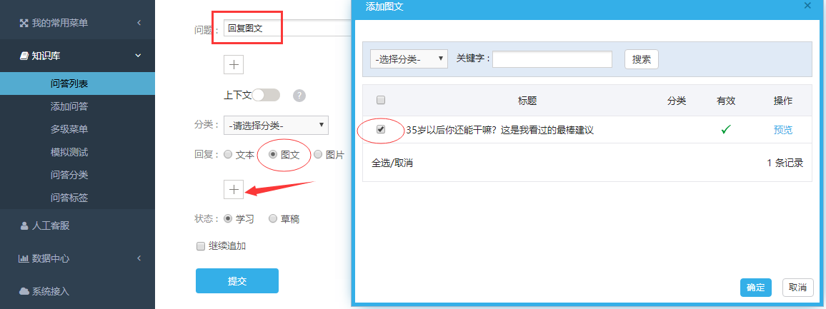 4、进入知识库->问答列表->添加问答,设置触发问题,添加这个图文作为回复,在手机微信端看效果。