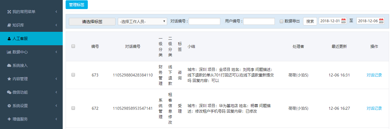 您可以在【人工客服→对话小结】,看到所有小结及对话详情,并自由导出所有数据。
